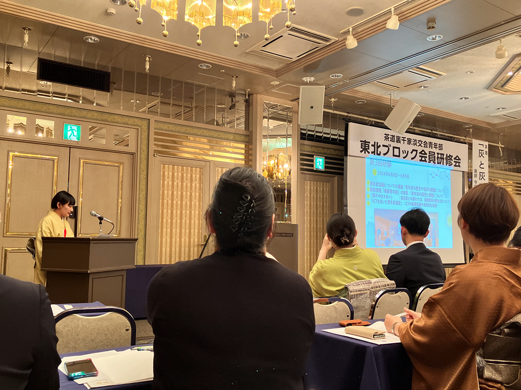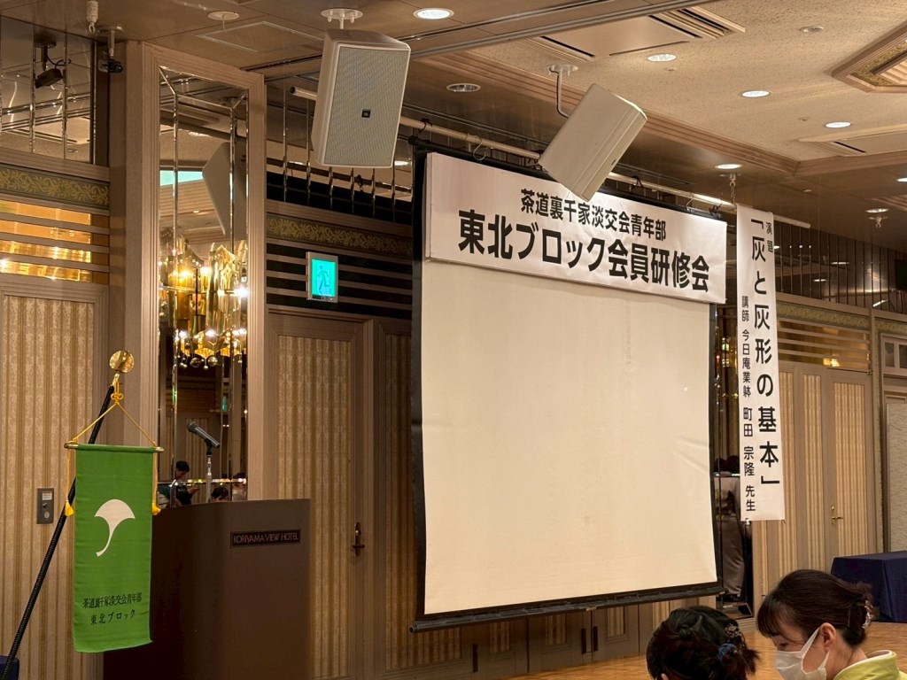このたび、東北ブロック会員研修会に参加いたしました。呈茶では、開催地である福島県ならではのおもてなしと、秋の趣を感じるお道具を拝見し、心豊かなひとときを過ごさせていただきました。開会式後の総本部報告では、松尾様より、鵬雲斎宗匠のお別れ会やご宗家の近況のご報告と、青年部会員の現状については、具体的な数値を交えてお話しいただきました。青年部の今後の活動について改めて考える貴重な機会となりました。全国委員メッセージでは、栁川議長よりご自身のご経験をもとに、親先生との関係の築き方や青年部の組織運営について、有意義なお話を拝聴いたしました。
