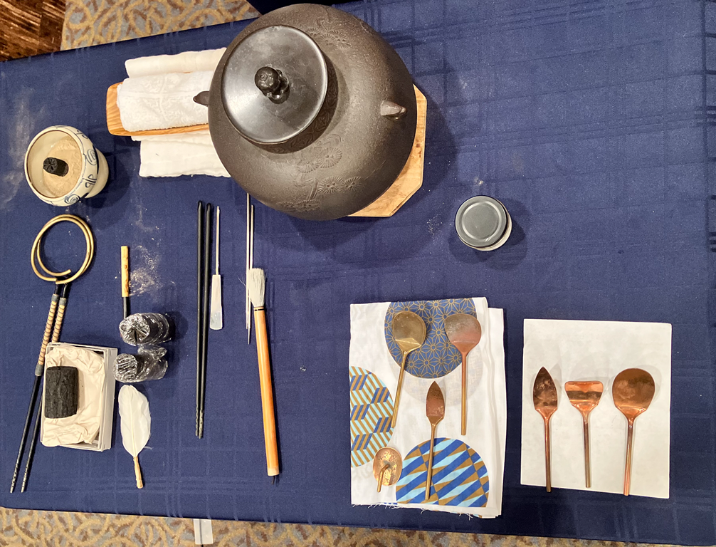 講演会「灰と灰形の基本」では、今日庵業躰の町田宗隆先生より、風炉の歴史から灰形の種類のお話、灰形のコツまで、時間いっぱいに丁寧にご指導いただきました。先生の手元を間近に見ることができるようデジタル機器を活用されるなど、参加者へのお心配りが随所に感じられました。